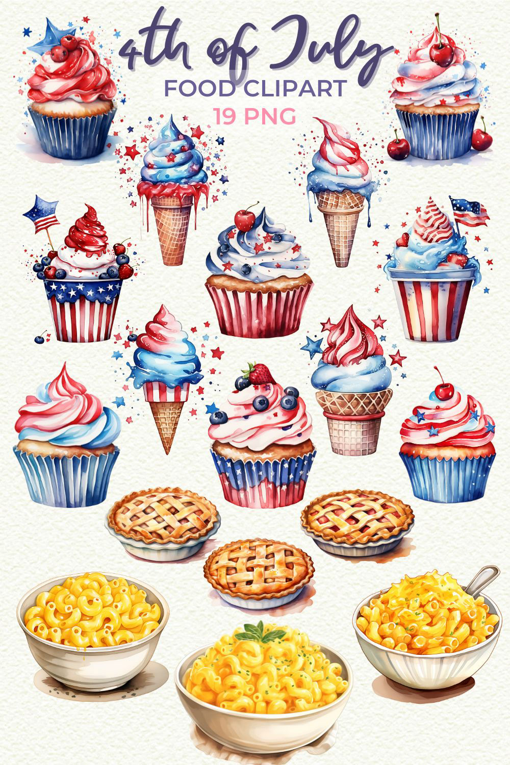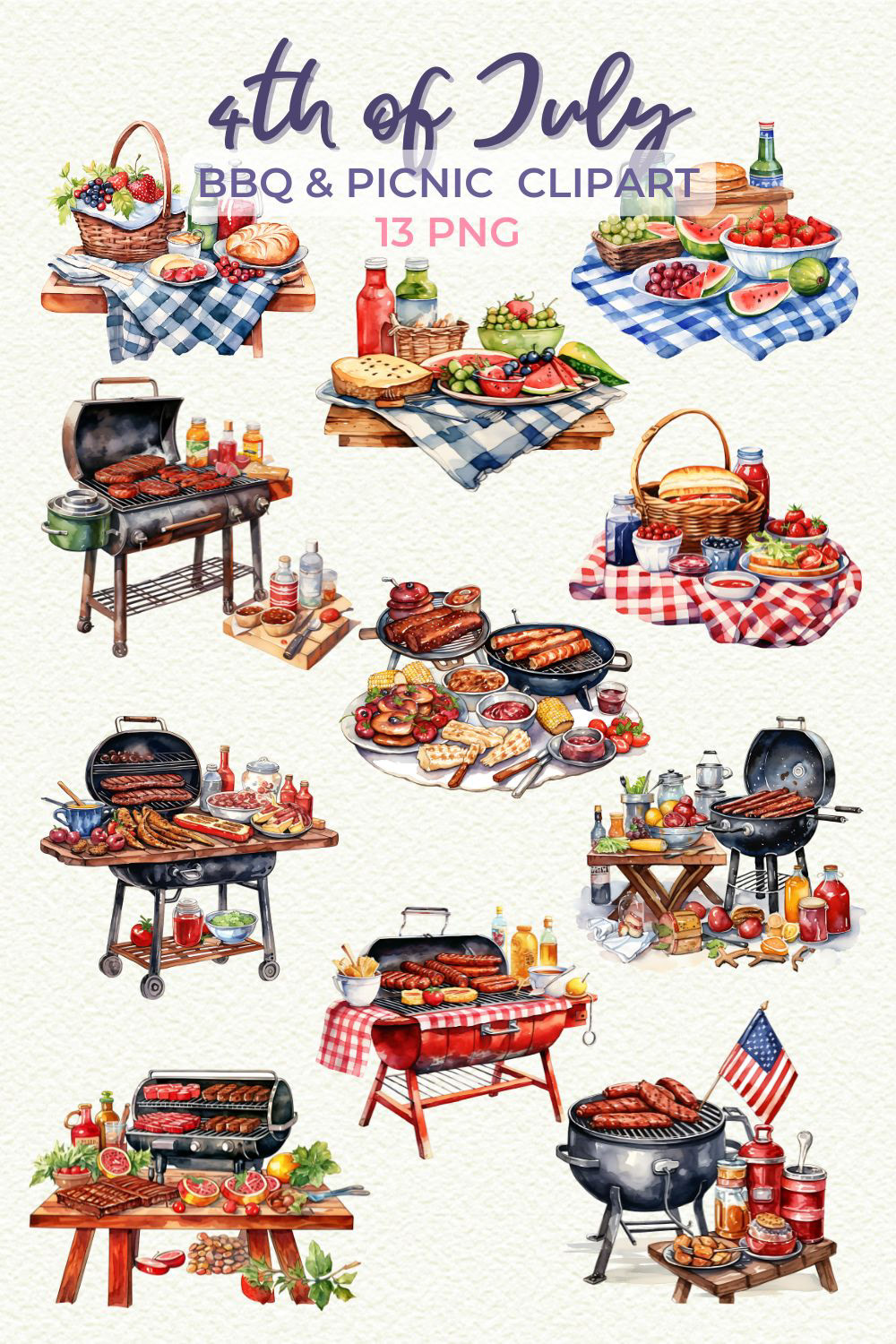 Elements include: BBQs, patriotic desserts, flags, hats, balloons, stars, cupcakes, USA map, and more.