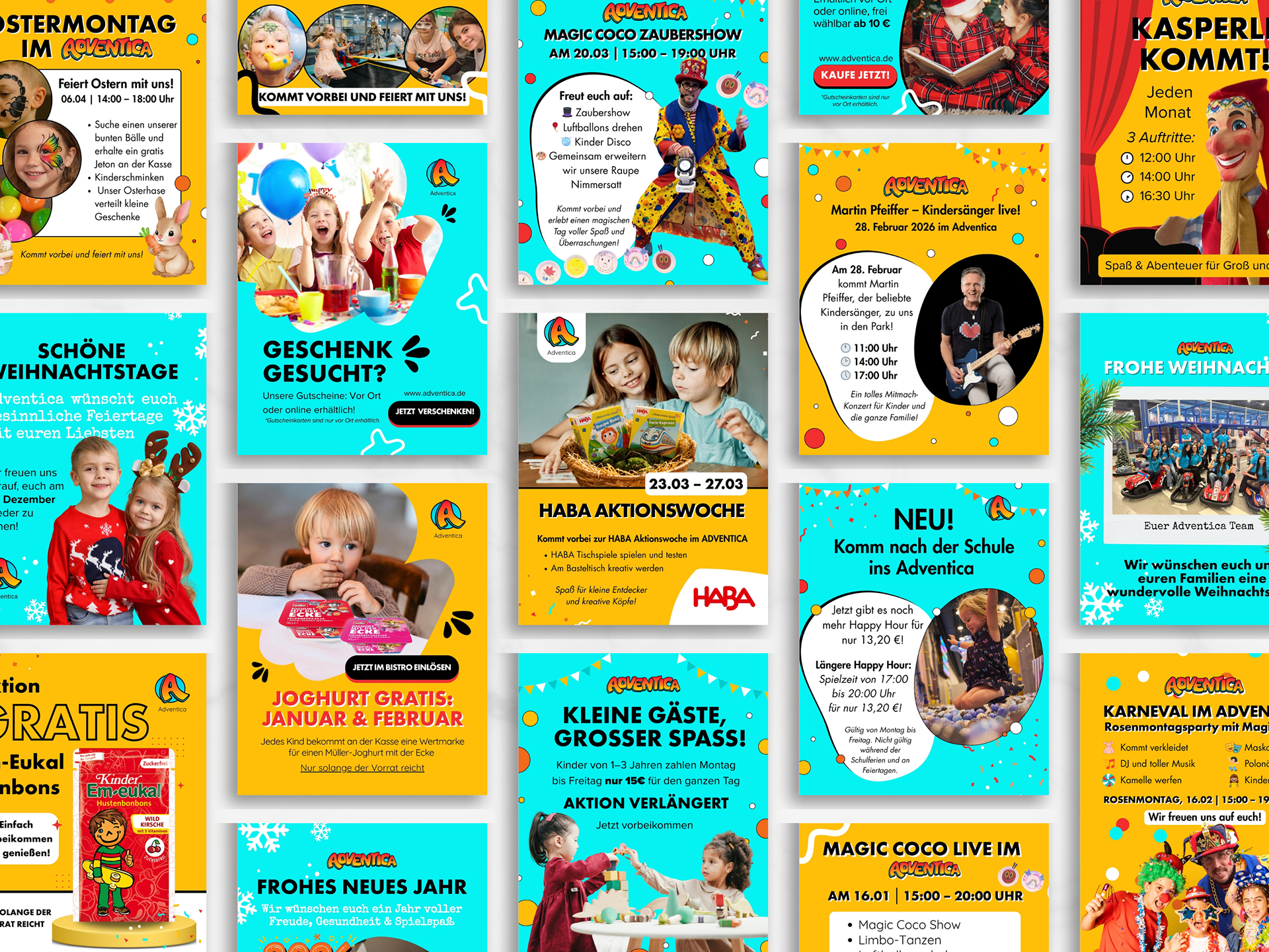 The park needed clear and engaging visual materials to communicate information, promote events, and guide visitors throughout the space while maintaining a consistent and playful visual style.