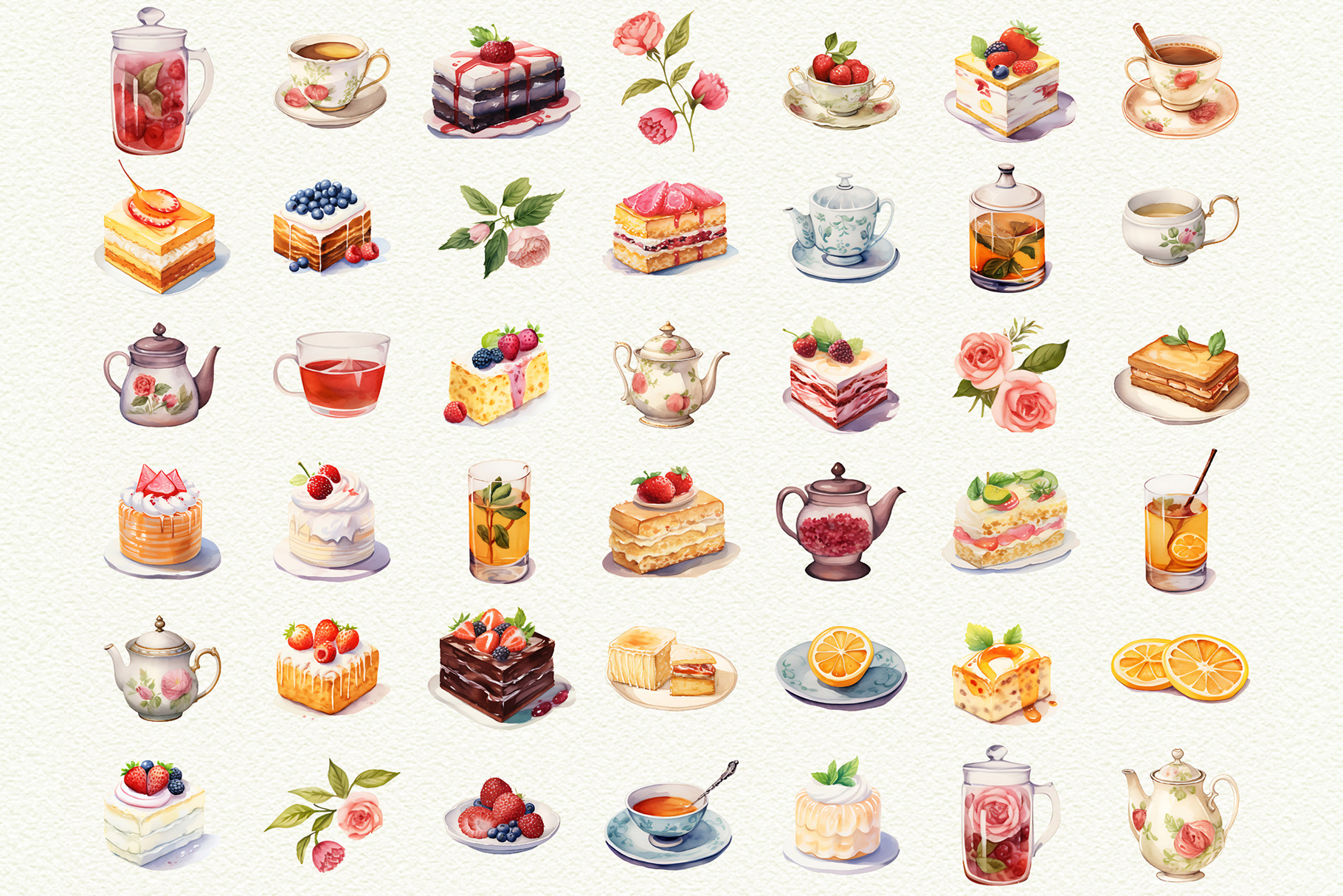 Elements include: teapots, teacups, cupcakes, cakes, cookies, florals & more