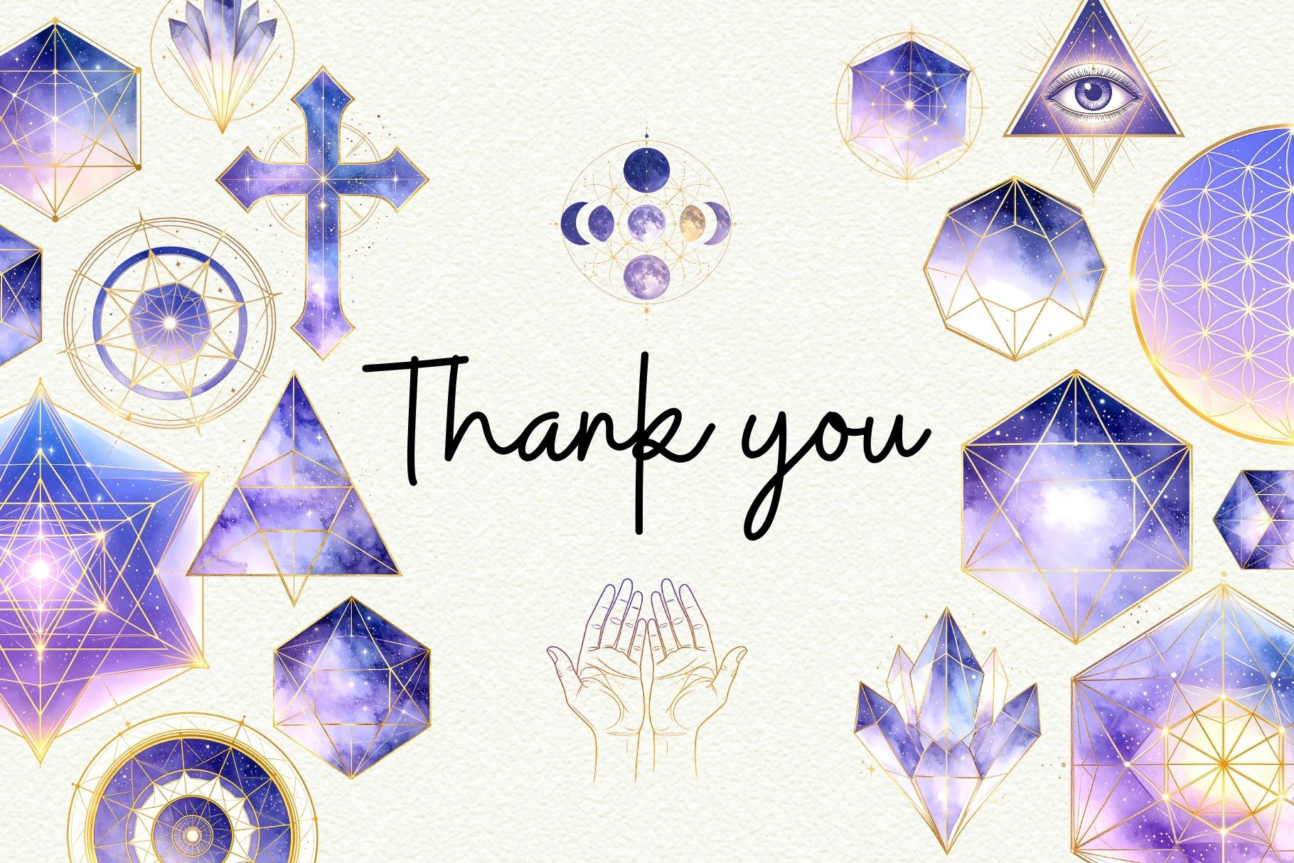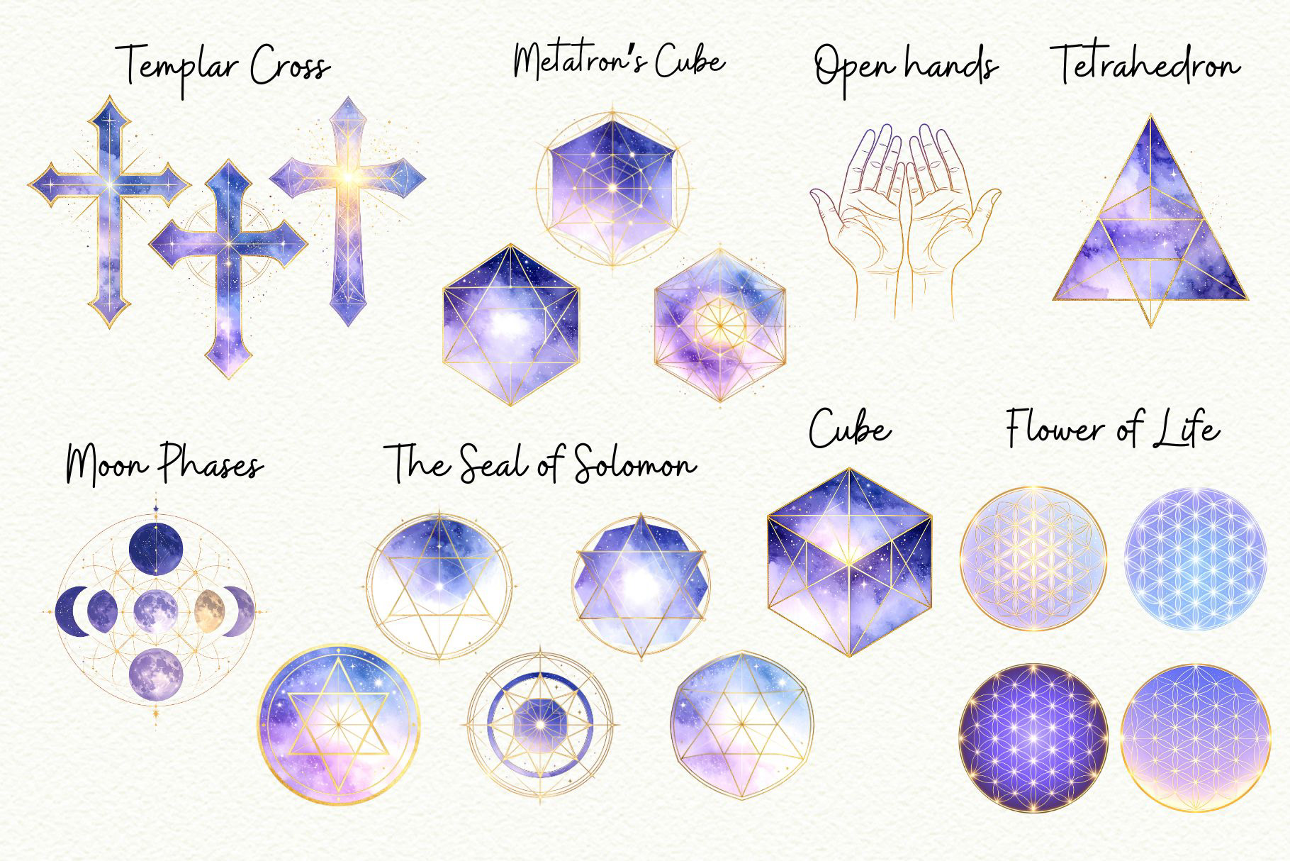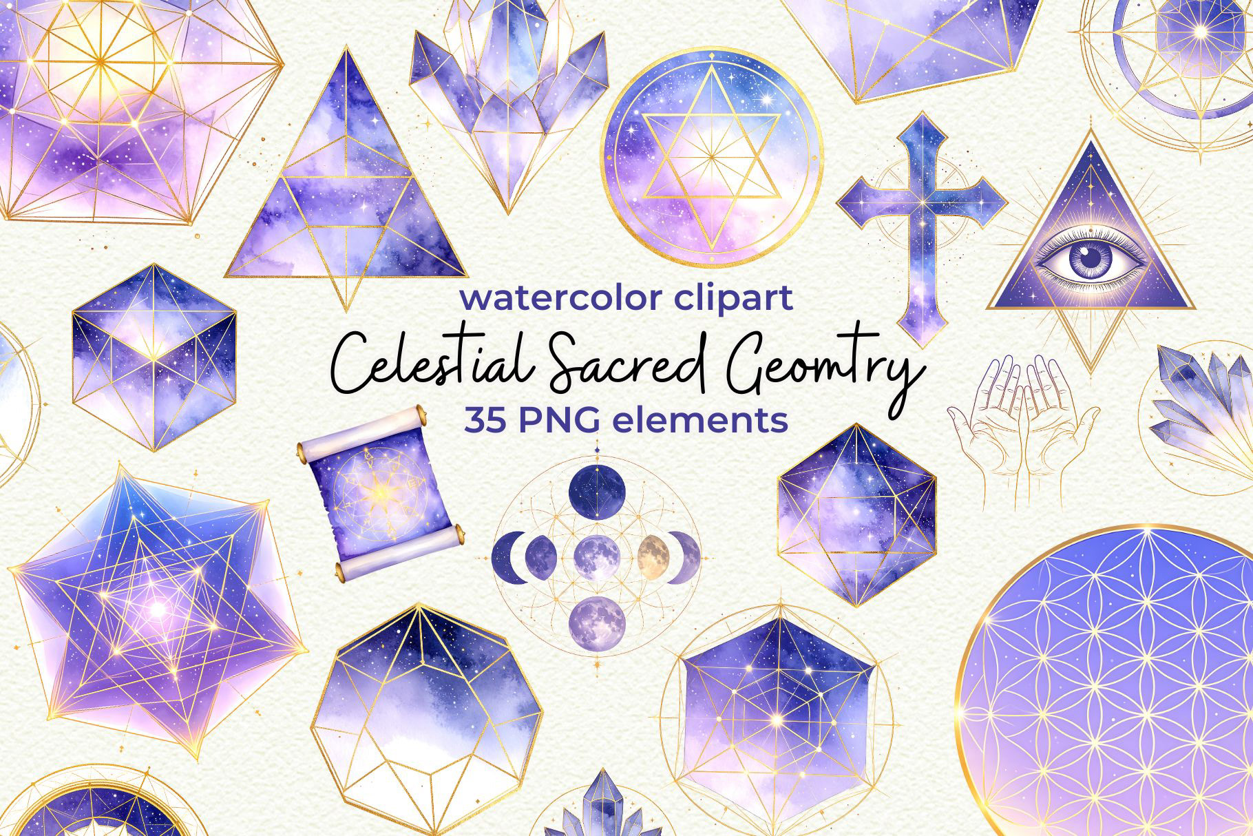 Add a cosmic glow to your creative work with this Celestial Sacred Geometry Clipart Set! Featuring deep purple galaxy gradients and shimmering gold accents, these watercolor illustrations blend ancient symbolism with ethereal, mystical energy. Ideal for spiritual art, tarot designs, wellness branding, and moon-phase journals.
