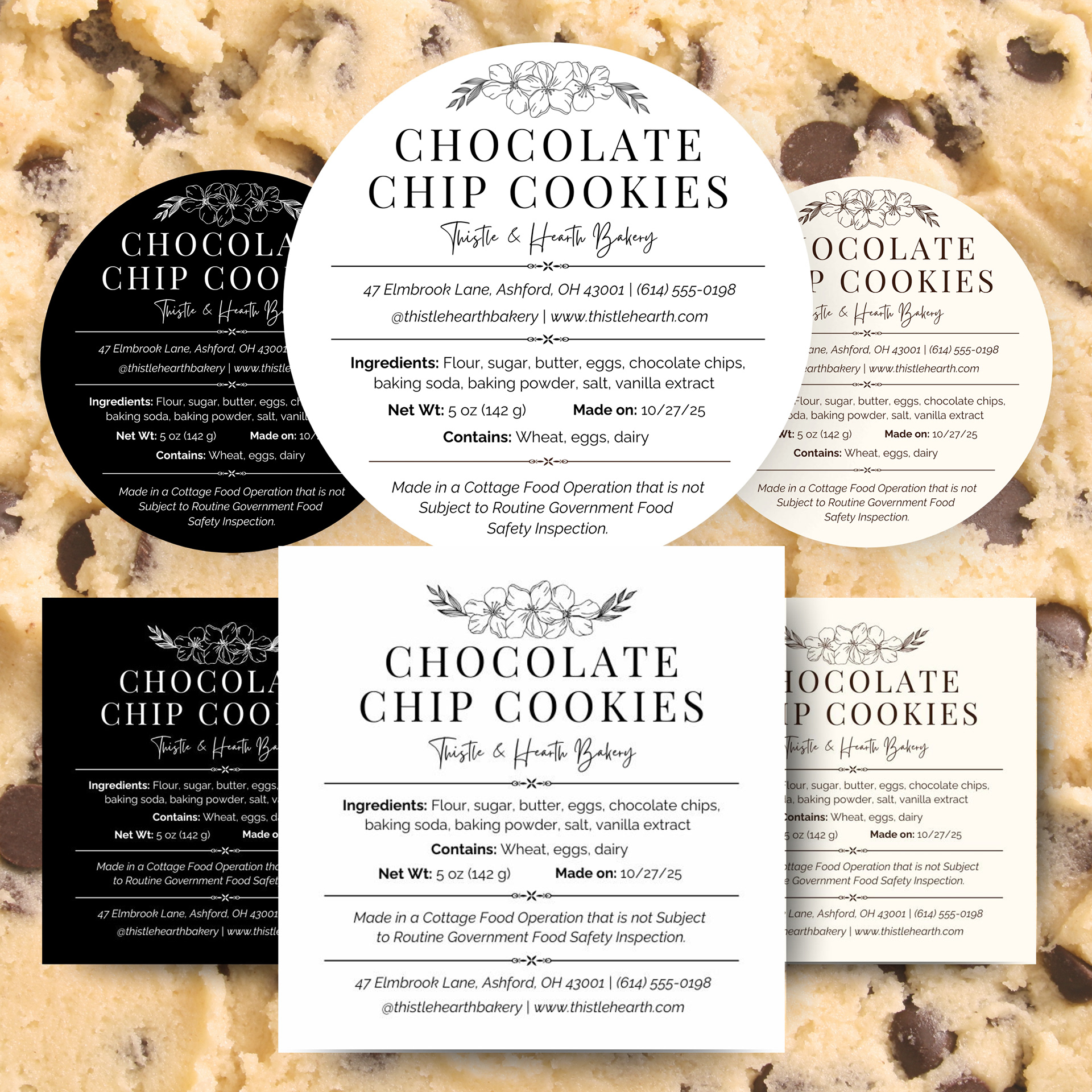 I explored warm neutral palettes, elegant serif typography and soft botanical accents to create a minimal cottagecore look. Each layout was structured to meet US cottage food labeling requirements while staying visually clean.