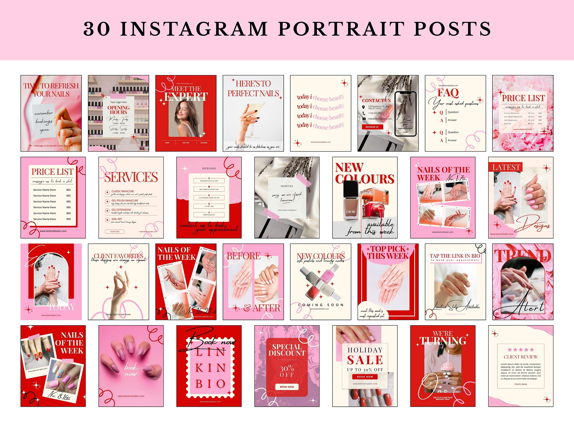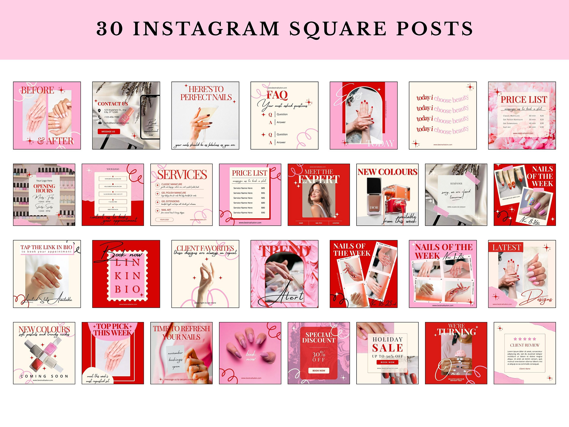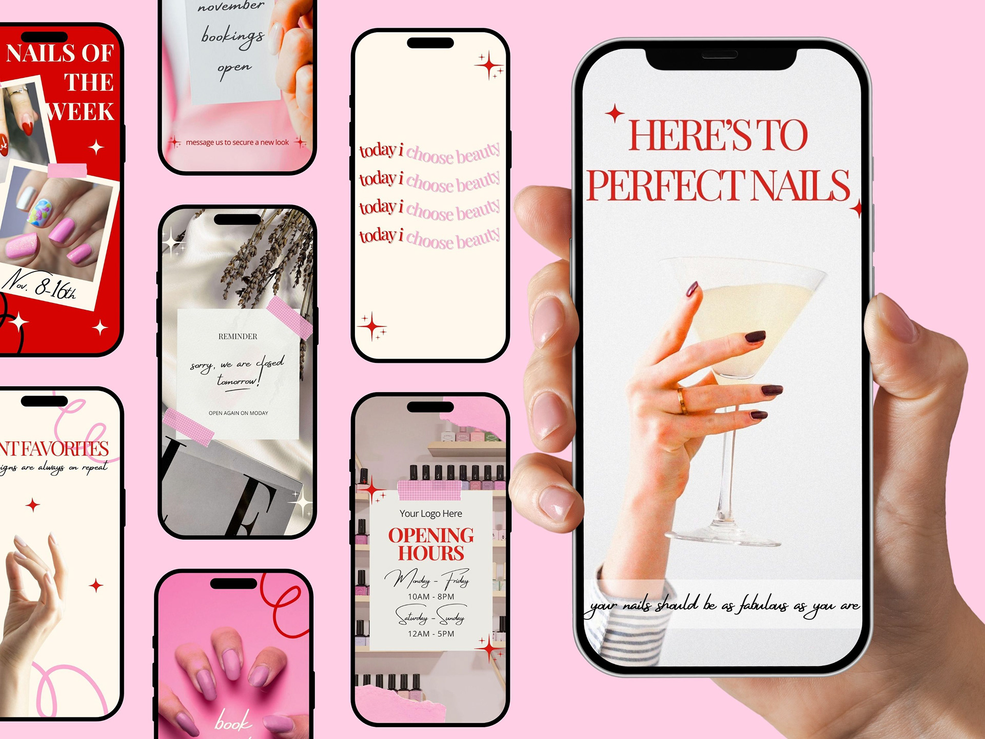 A collection of modern feminine Instagram templates made for nail salons, beauty studios and self-care brands. Designed to create a fresh, elegant and versatile visual identity that helps professionals showcase their services beautifully.