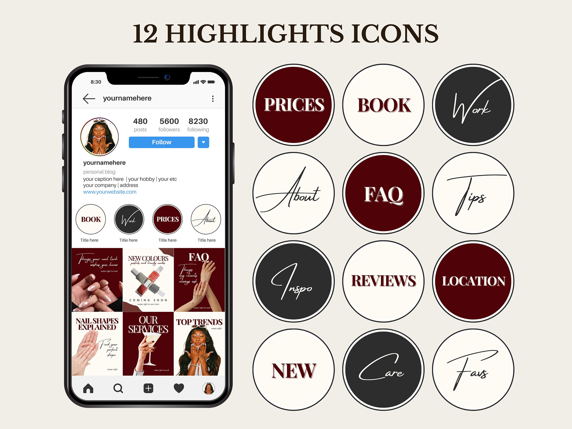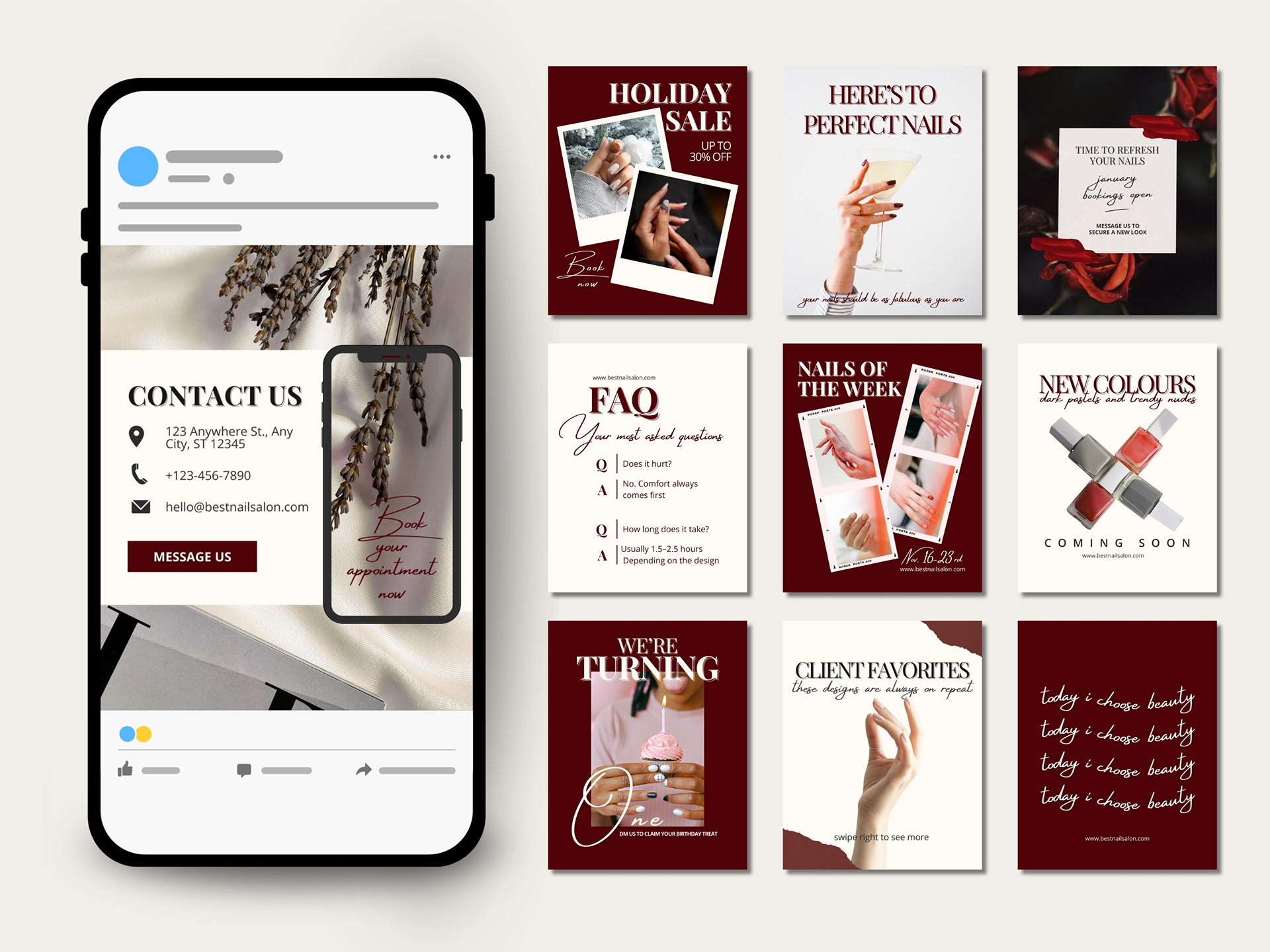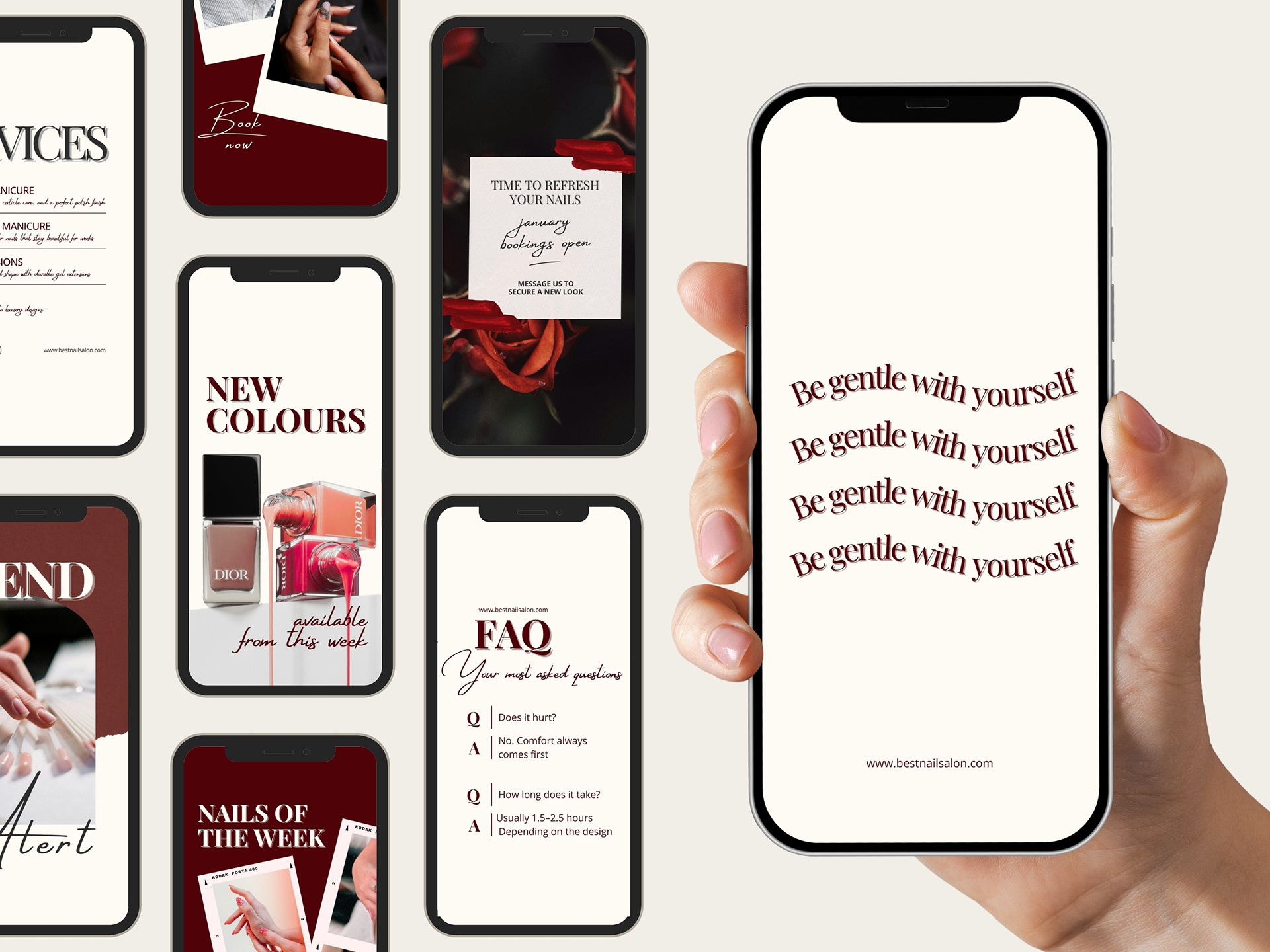 A collection of modern feminine Instagram designs made for nail salons, beauty studios and self-care brands. Designed to create a fresh, elegant and versatile visual identity that helps professionals showcase their services beautifully.