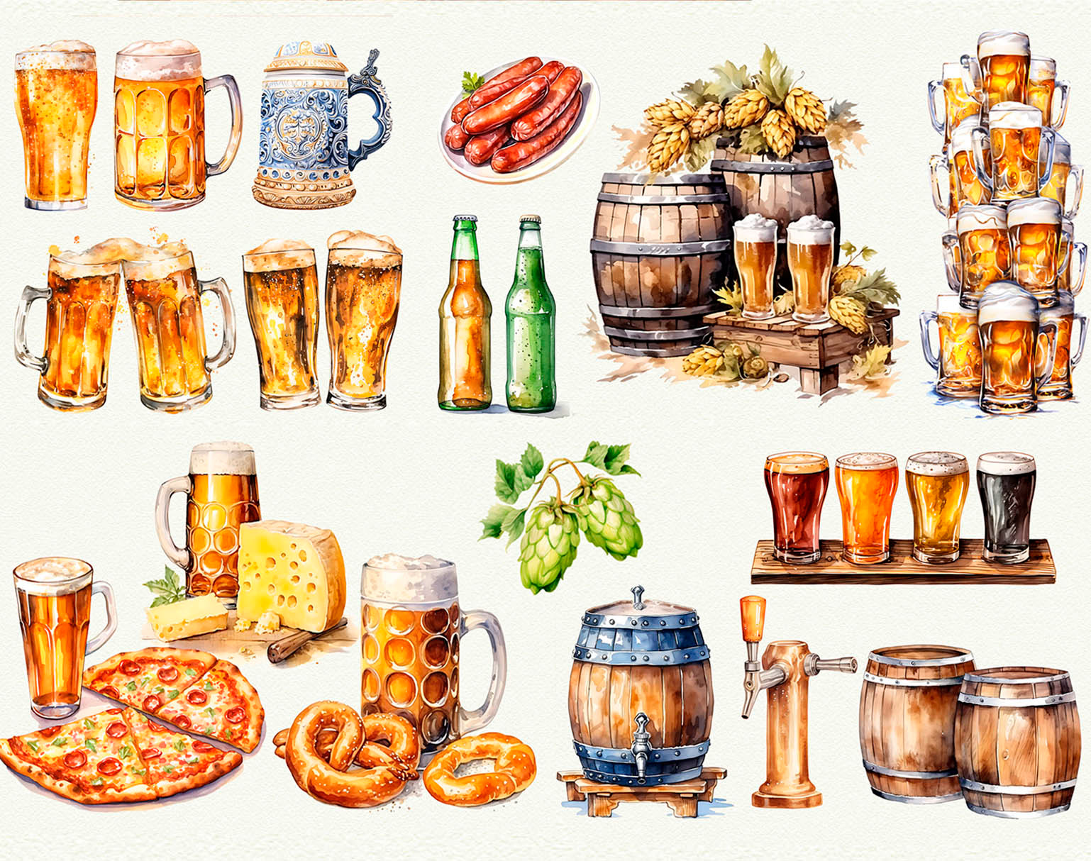 Watercolor-style illustrations: beer, sausages, hops, mugs, hats & more