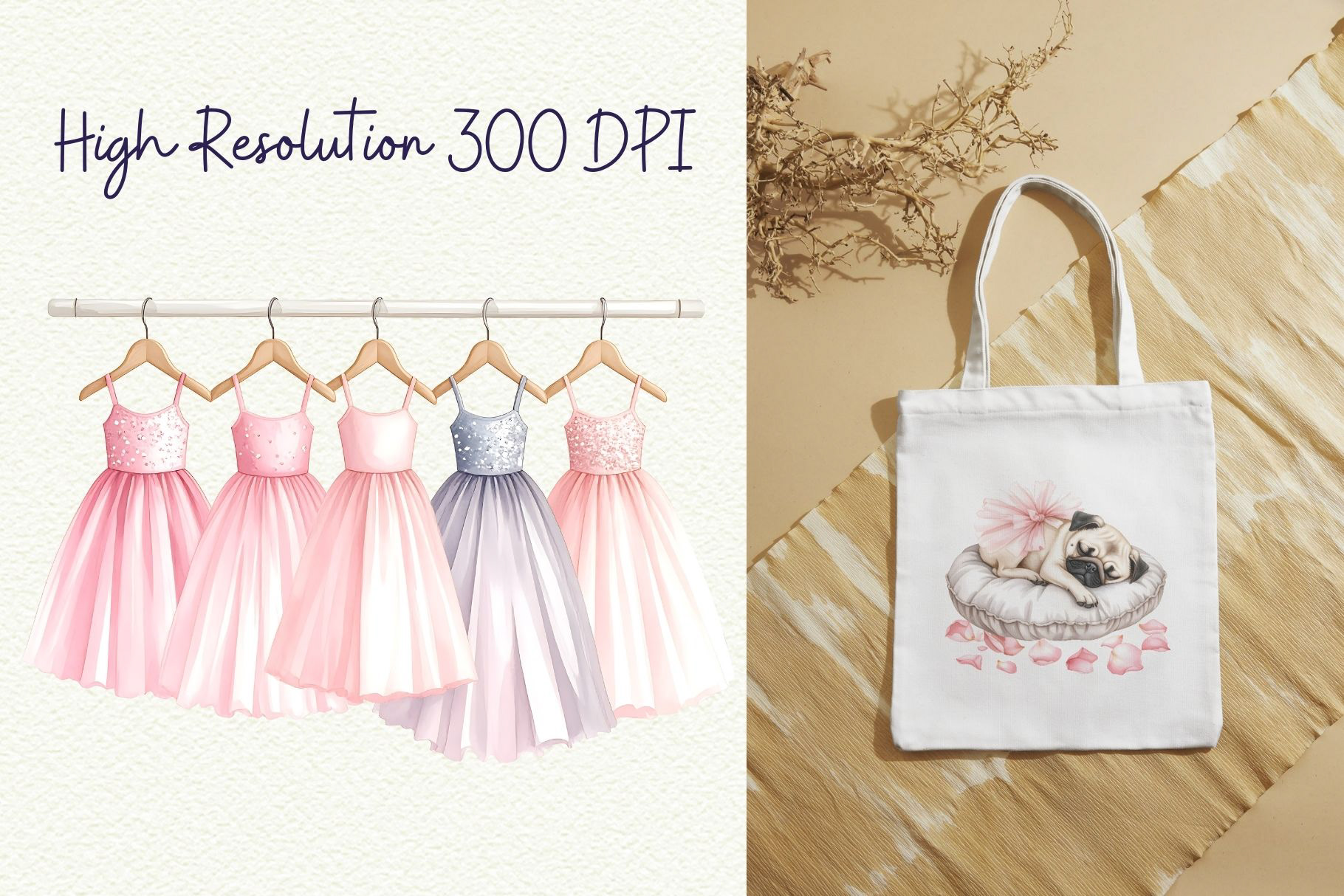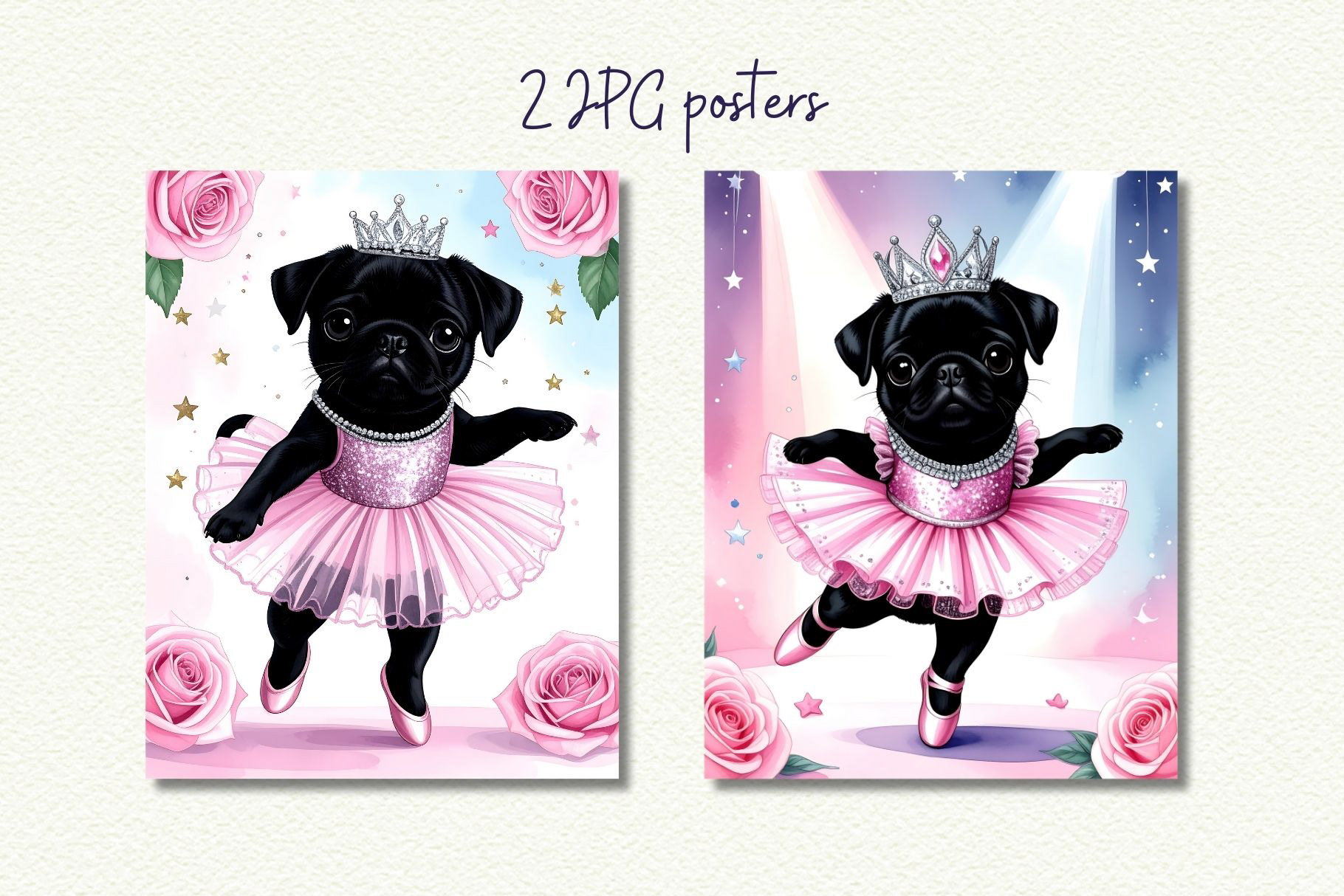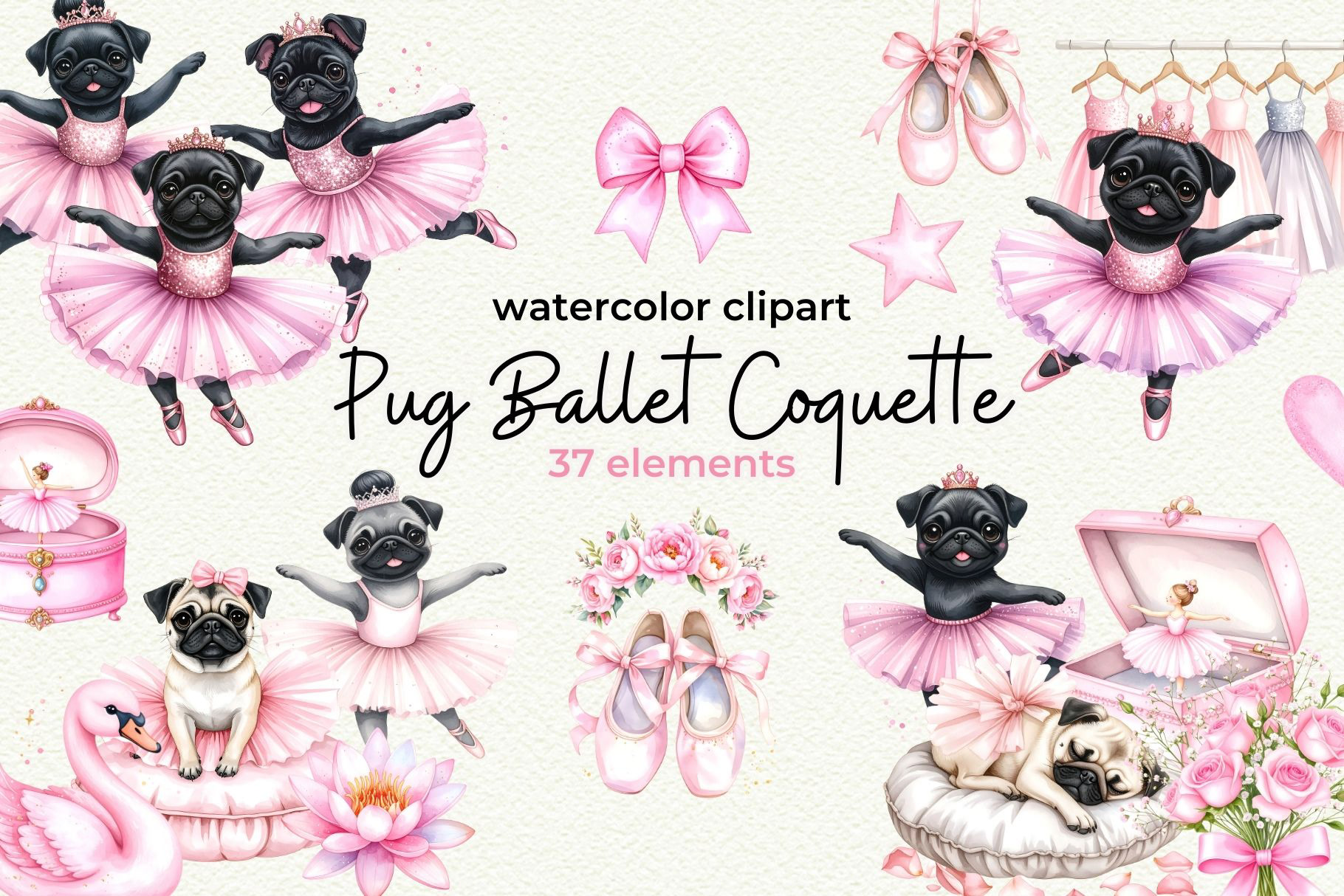 Bring sweetness and charm to your designs with this Pug Ballet Coquette Clipart Set. Featuring darling watercolor illustrations of a pug ballerina in pink tutus, satin bows, and dainty ballet shoes, this set is perfect for creating baby girl nursery wall art, invitations, and girly party decor. Soft pastel tones and coquette details make these illustrations timelessly cute and elegant.