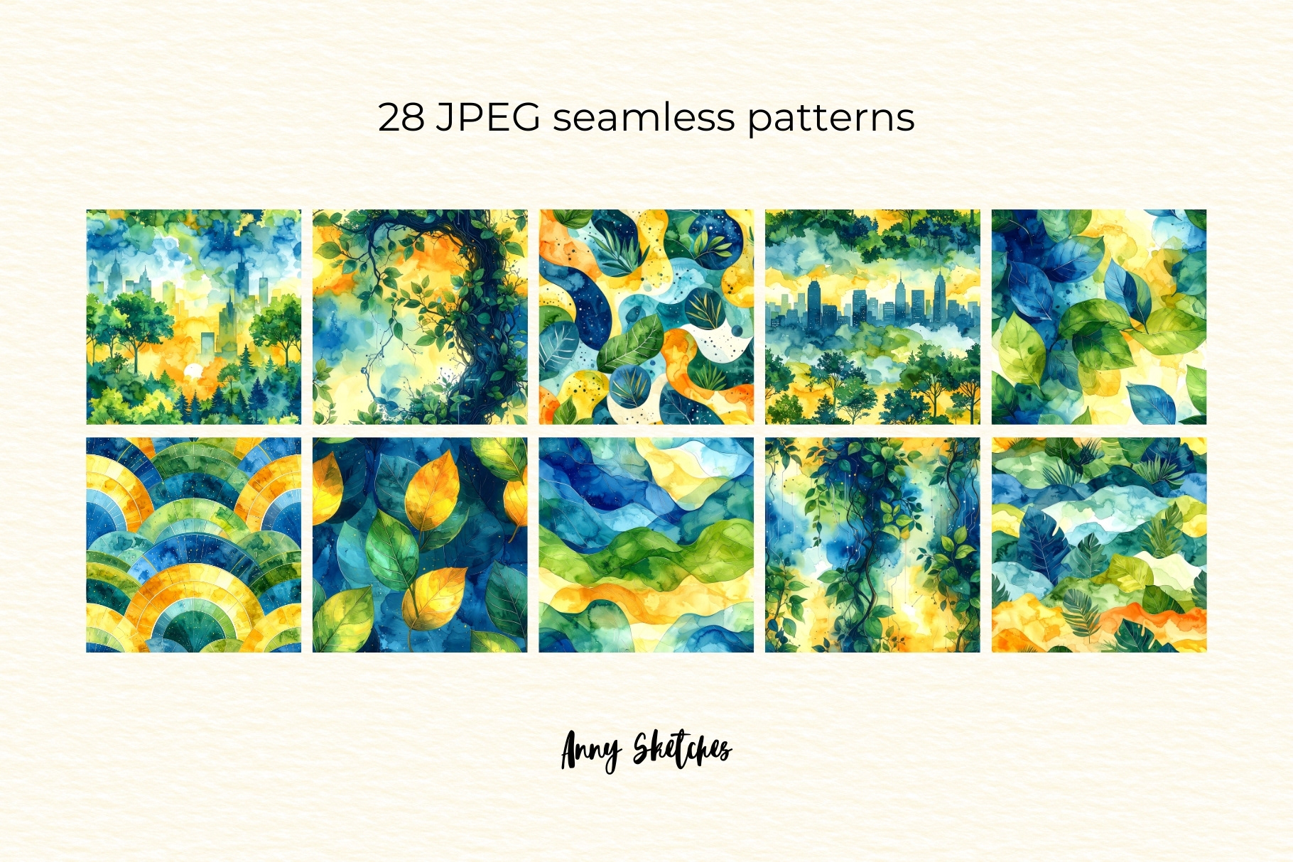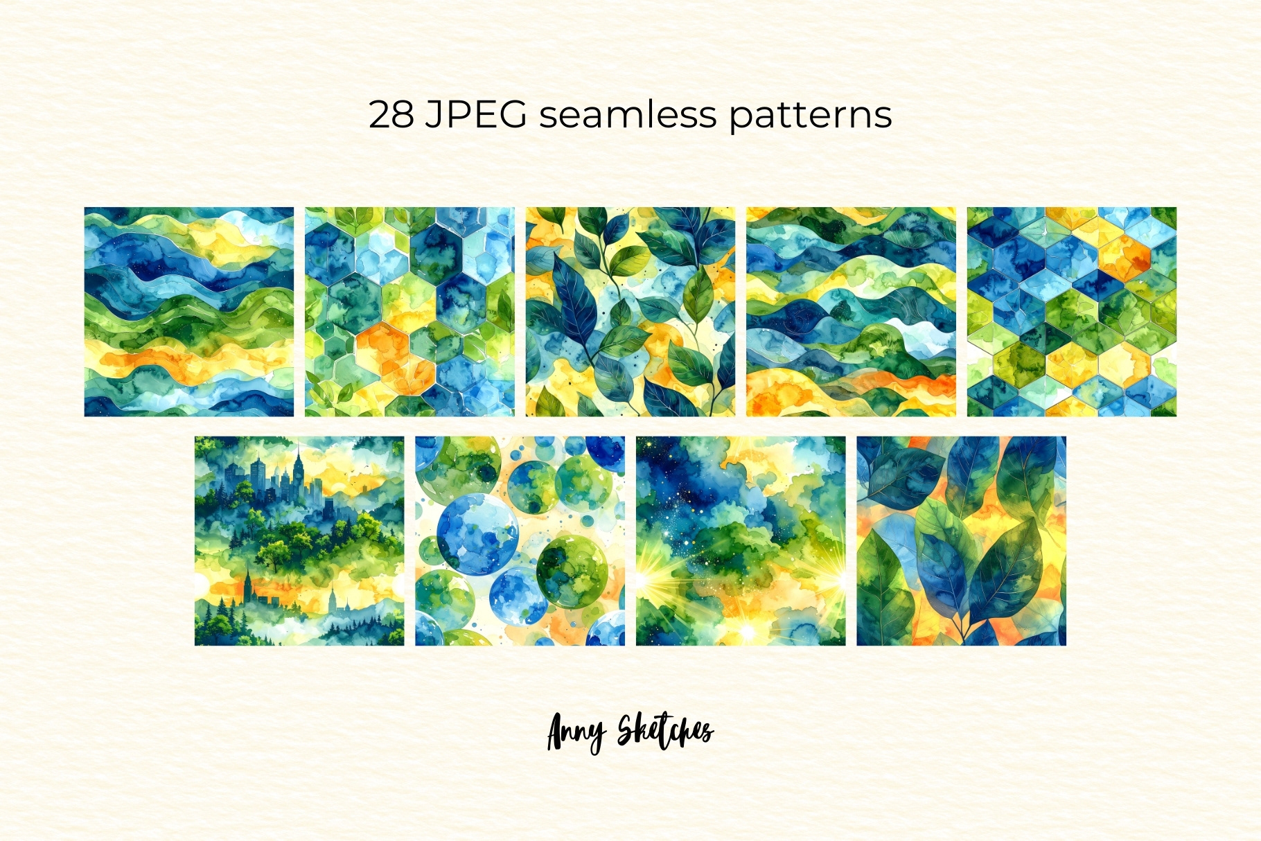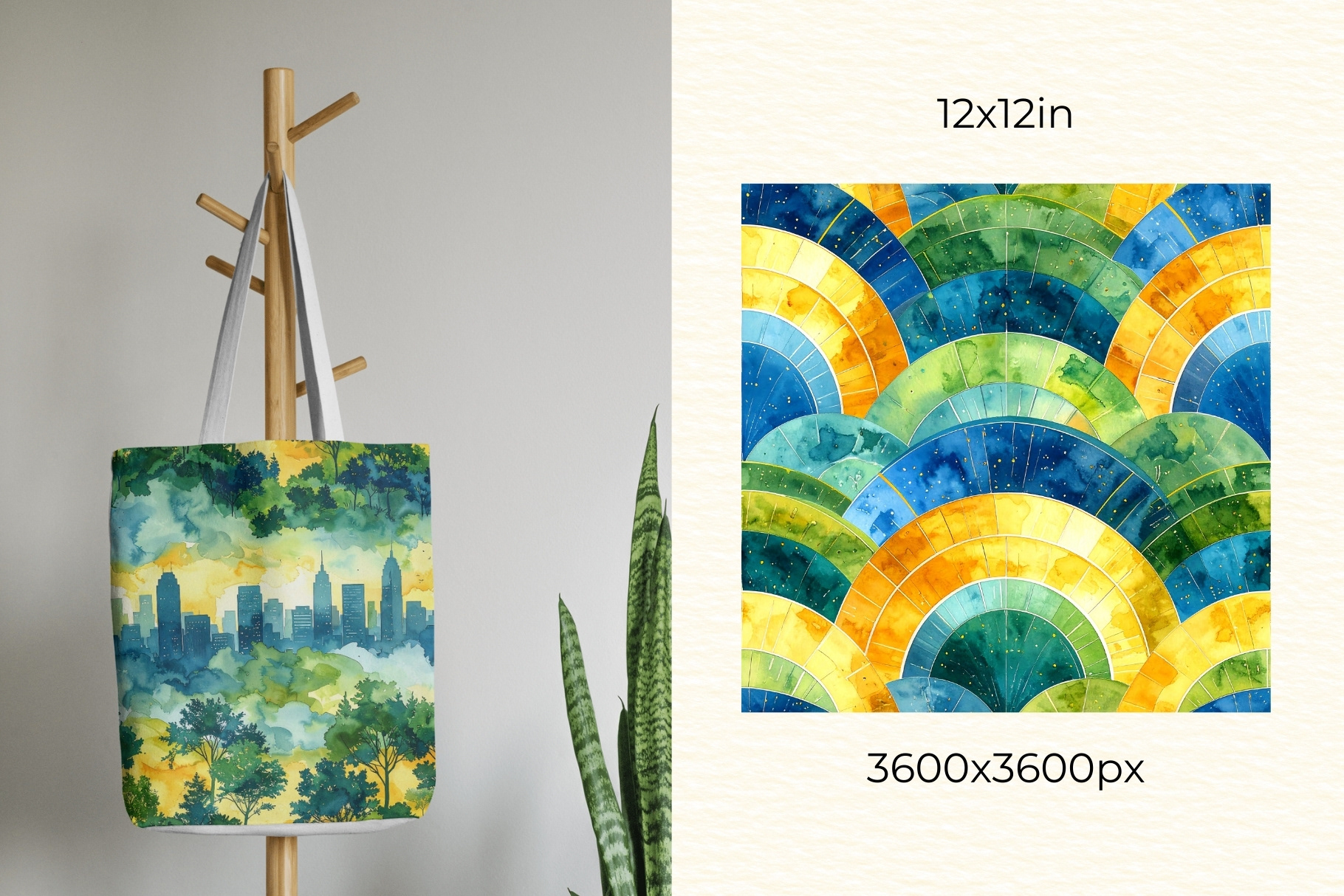 A future-focused pattern collection inspired by solarpunk aesthetics, sustainable living and harmony between nature and technology. Earthy greens, warm neutrals and optimistic futuristic elements define this modern eco-inspired set.