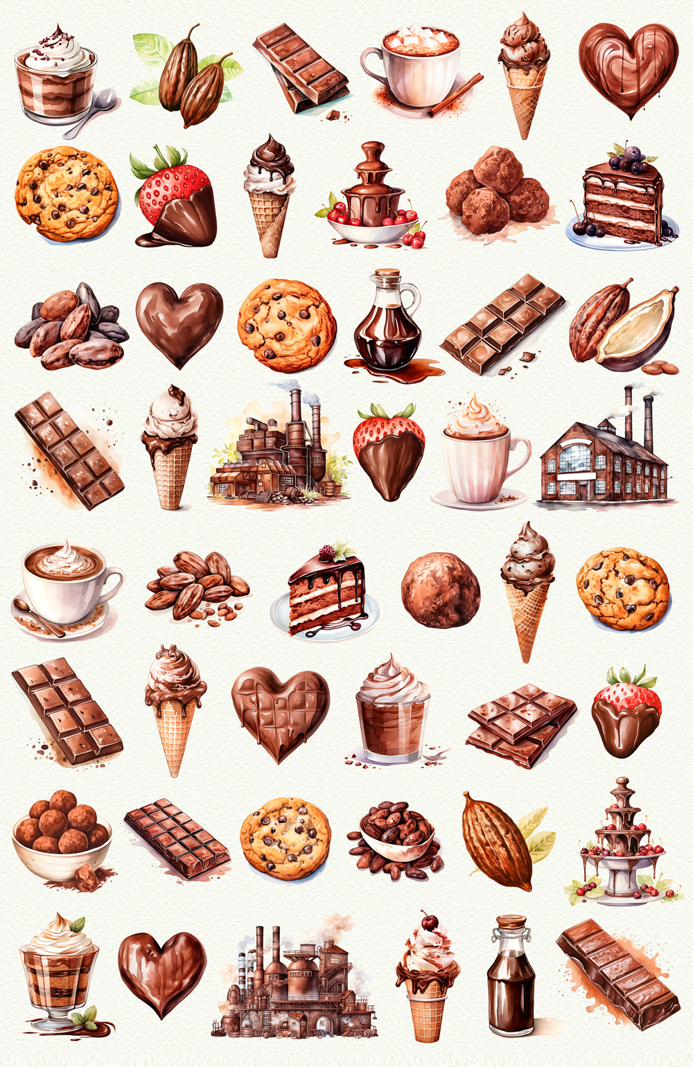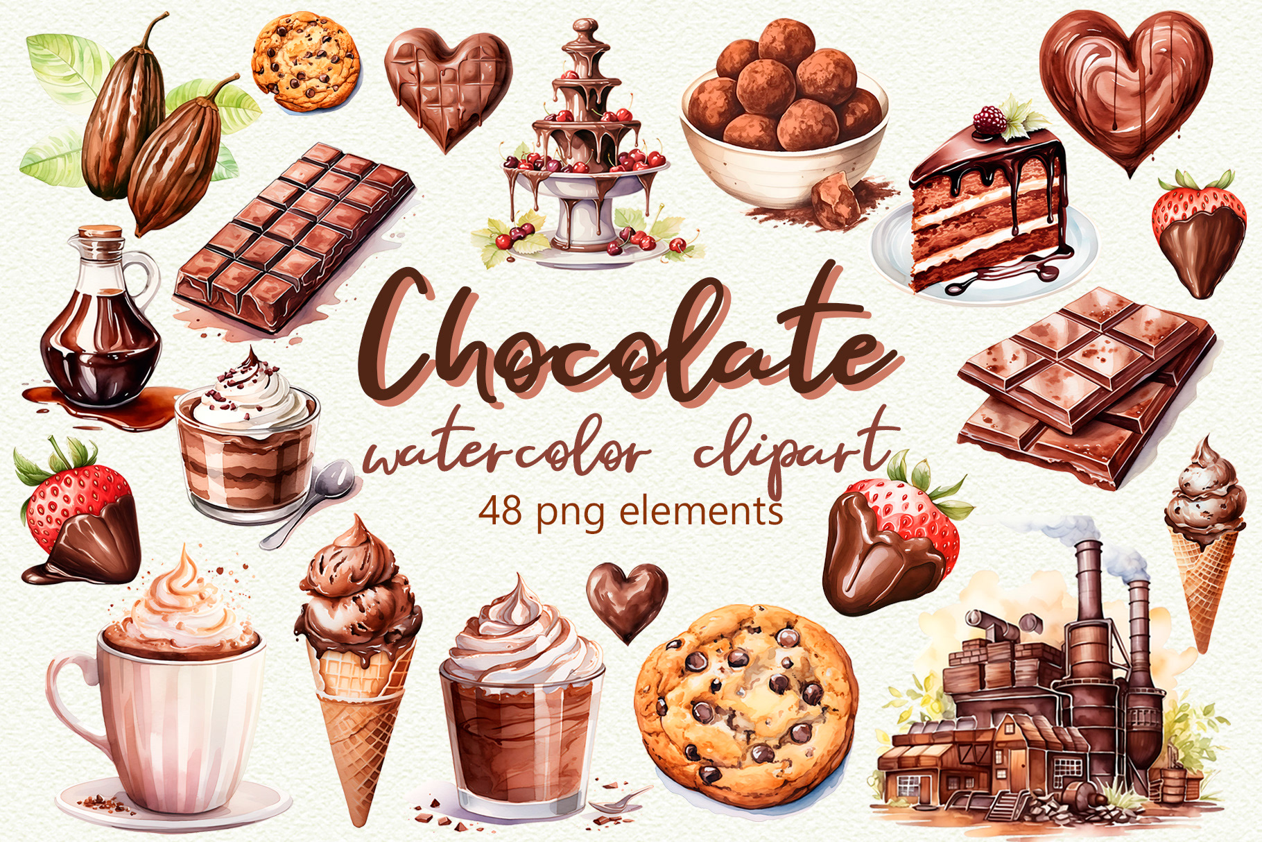 Indulge your designs with this delicious collection of watercolor chocolate clipart! This set includes 48 high-resolution PNG elements featuring truffles, chocolate factories, cakes, cocoa drinks, cookies, and more — perfect for cozy, elegant, or dessert-themed projects.